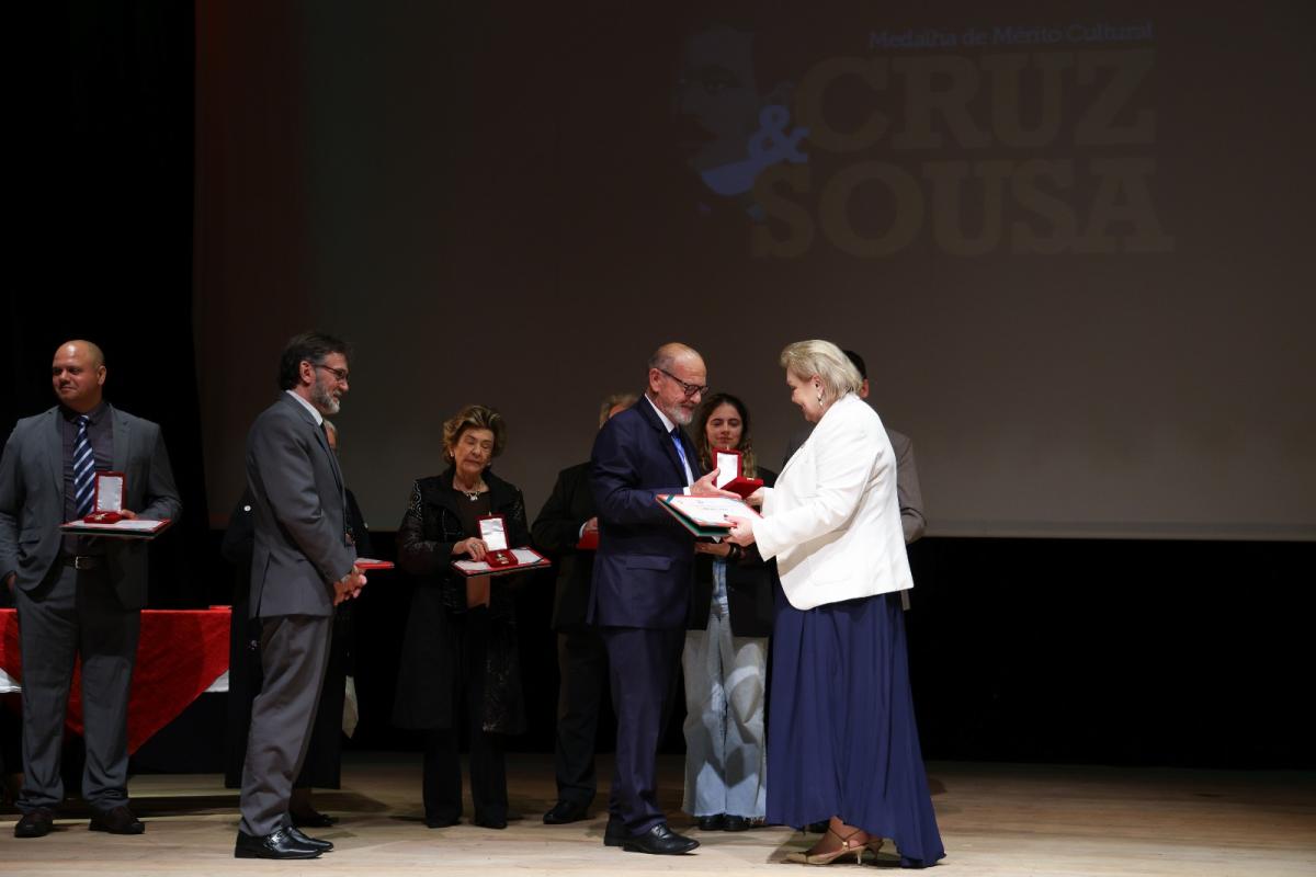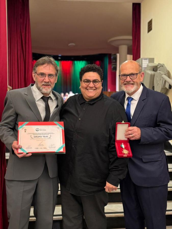 O Grupo Tejo foi homenageado na última segunda-feira (24), em Florianópolis, com a Medalha Cruz e Sousa, uma das mais altas distinções concedidas pelo Governo de Santa Catarina a instituições e personalidades que contribuem de forma decisiva para o desenvolvimento cultural do estado. A condecoração, que reconhece trajetórias de grande relevância artística e histórica, destaca o papel do Tejo como um dos pilares da arte catarinense, especialmente no teatro e no carnaval.