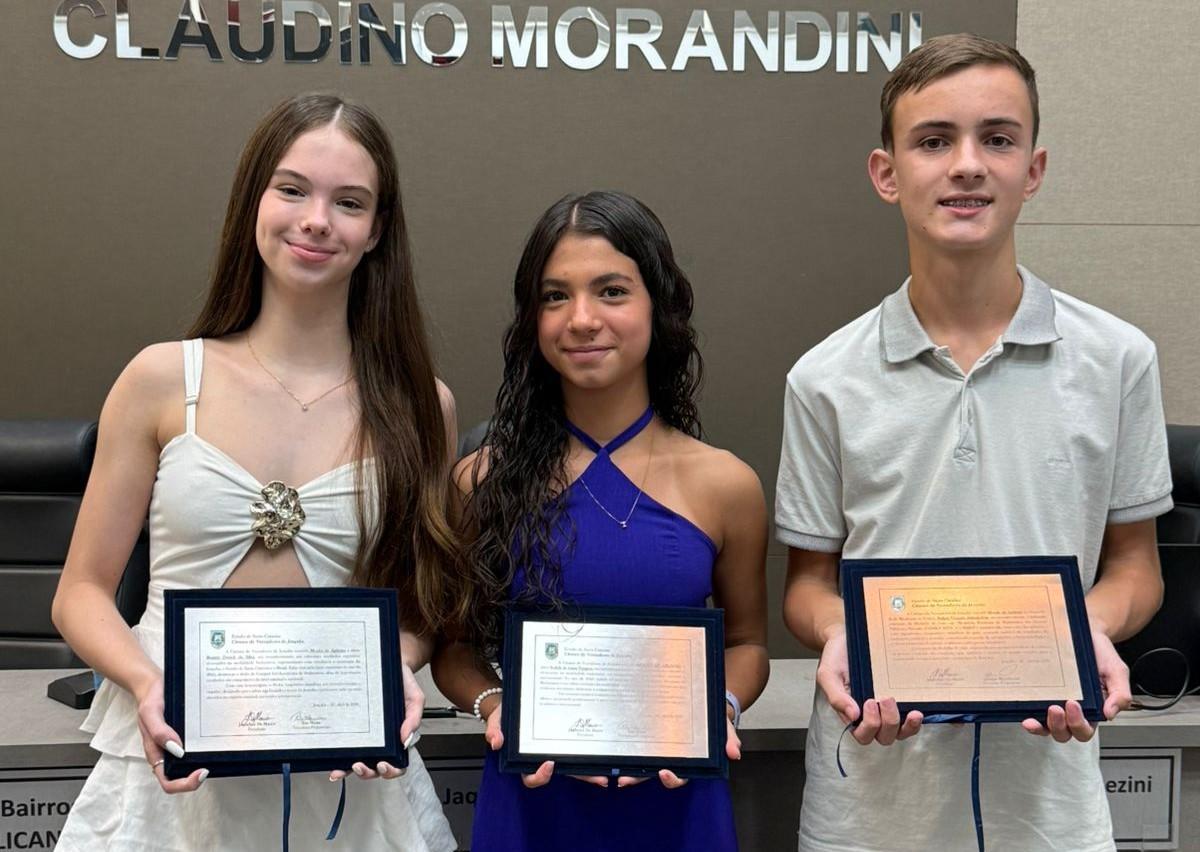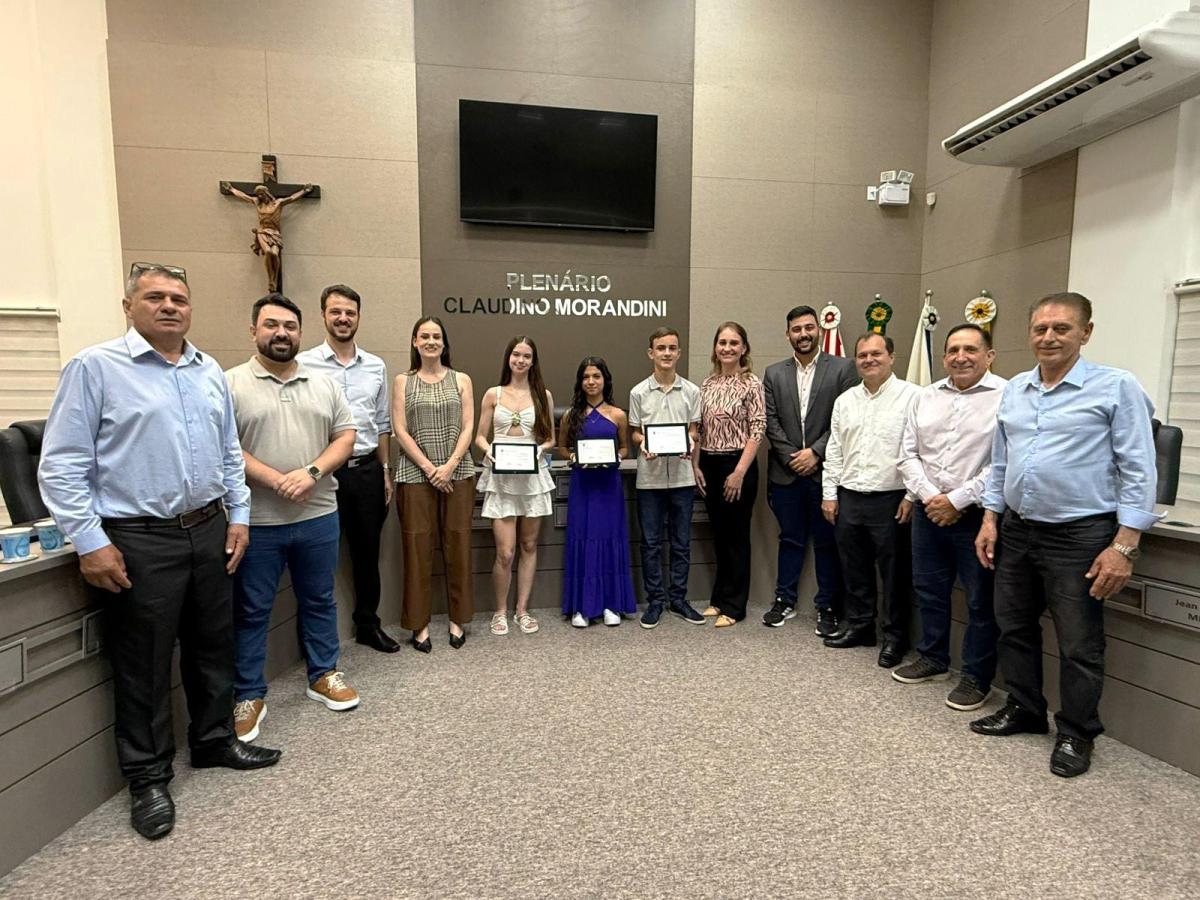 Beatriz Detsch da Silva e Isabeli de Lima Taugem foram indicadas pela vereadora Rita Weiss para receberem a Moção de Aplauso pelas importantes conquistas na modalidade de badminton. Já o aluno do Centro de Educação Roberto Trompowski (CERT), Rafael Graneto Altenhofen, recebeu a Moção de Aplauso pela conquista da Medalha de Ouro na Olimpíada Brasileira de Matemática de 2026. Ele foi indicado pelo vereador Alcione Marchezini.