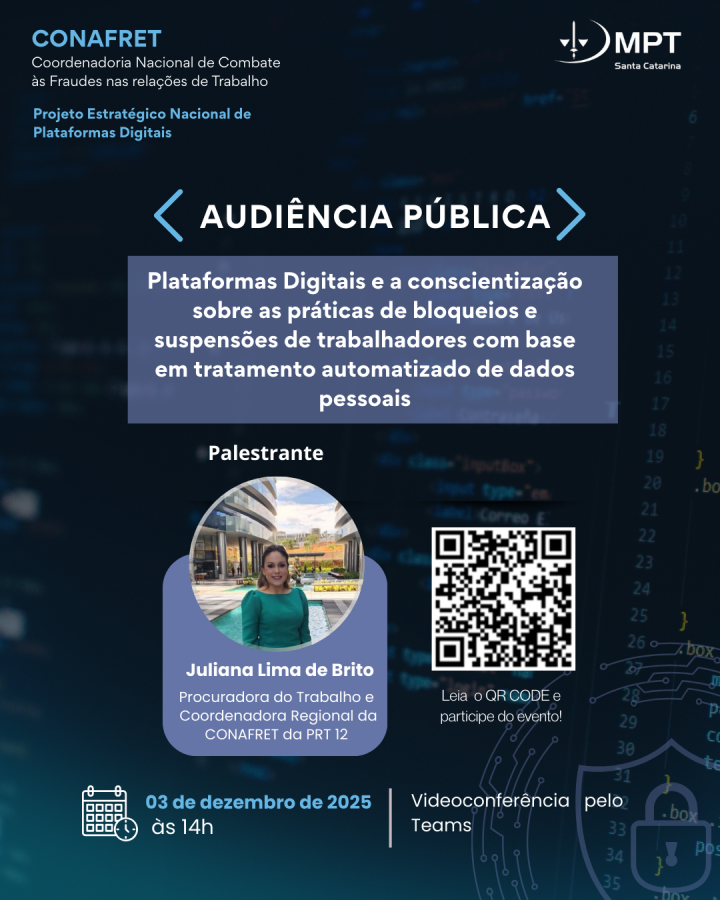 Joaçaba - O Ministério Público do Trabalho em Santa Catarina realizará no dia 03 de dezembro, às 14h, uma Audiência Pública para discutir o tema “Plataformas Digitais e a conscientização sobre as práticas de bloqueios e suspensões de trabalhadores com base em tratamento automatizado de dados pessoais”. O evento será transmitido por videoconferência na Plataforma Teams (pelo link: Link ) e conduzido pela Procuradora do Trabalho Juliana Lima de Brito, da PTM de Joaçaba, e Coordenadora Regional em Santa Catarina da Coordenadoria Nacional de Combate às Fraudes nas Relações de Trabalho (CONAFRET).