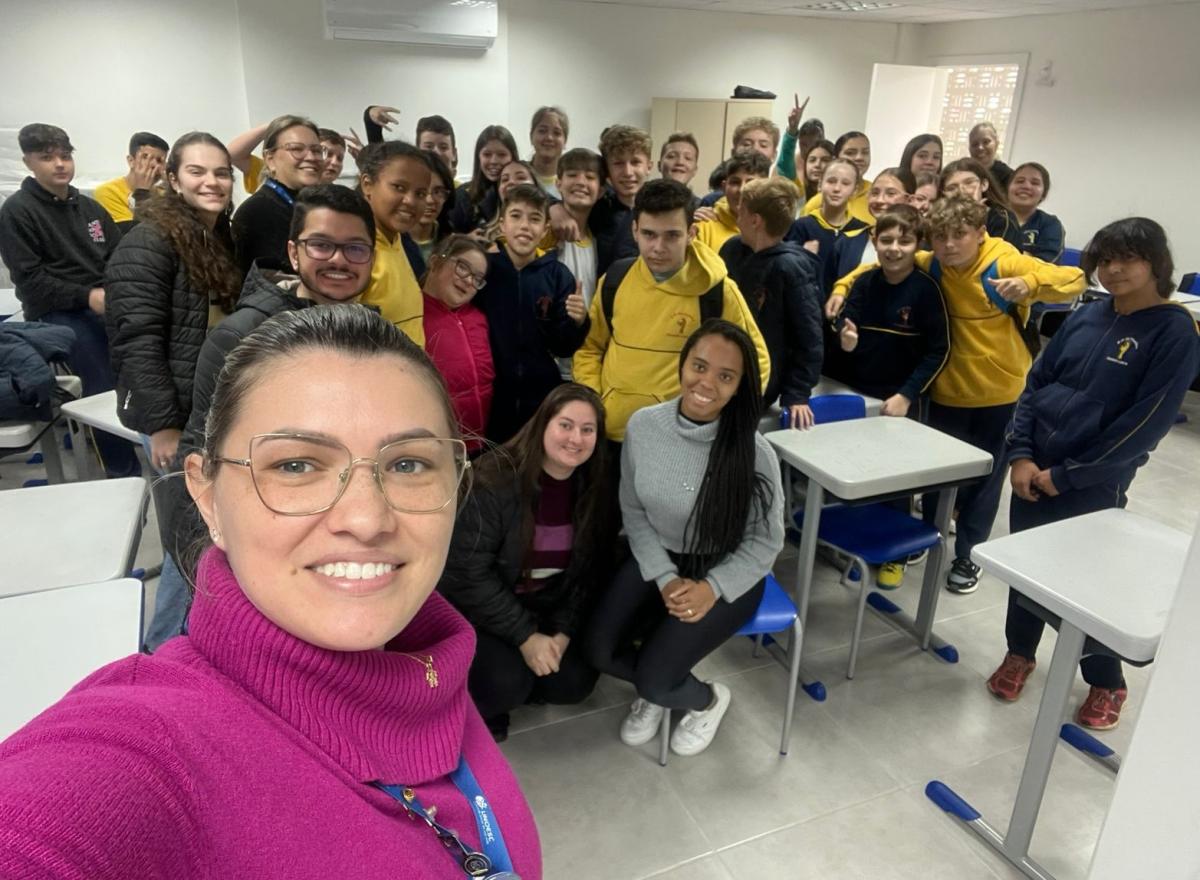 No dia (7), a coordenadora do Núcleo de Apoio Contábil e Fiscal (NAF) da Unoesc, professora Ana Lúcia Behrend Listone, e a coordenadora dos cursos de Administração e Ciências Contábeis da Unoesc On-line, professora Suélen Aparecida Padilha Prando, acompanhadas dos estudantes dos cursos de Administração, Ciências Contábeis e Processos Gerenciais, Antônio Kauan Oliveira Nunes, Andreia Tatiane Sviderski, Rosa Vitoria Vargas, Diana Fedrizzi, Giovana Volff, Adriana Argenton e Marina Bordignon Nurille, conduziram a aplicação da dinâmica “A Ilha” aos estudantes das turmas de 7º e 8º ano do Ensino Fundamental na Escola Municipal São Francisco, localizada na cidade de Luzerna.