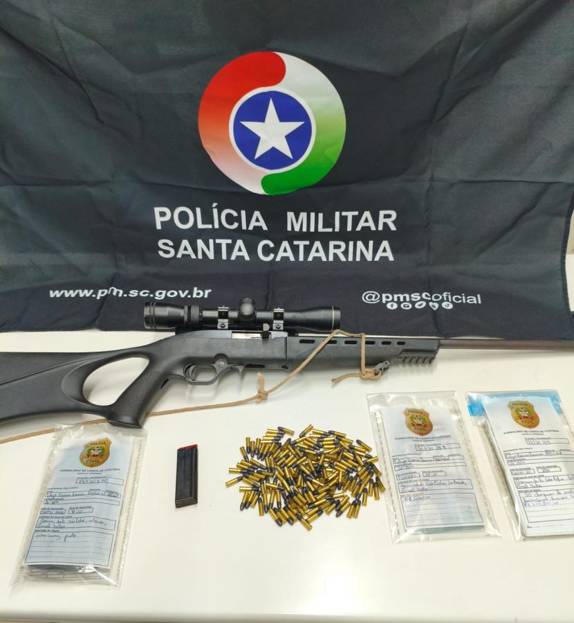 No local, a entrada foi autorizada pela moradora, companheira do suspeito, não sendo inicialmente localizado o masculino. Durante a permanência na residência, foi apreendida uma arma de fogo calibre .22, munições do mesmo calibre e um valor em dinheiro.