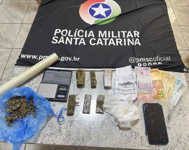 Durante rondas, os policiais abordaram um homem de 25 anos, que possuía em seu desfavor mandado de prisão expedido pela Comarca de Joaçaba, pelos crimes de tráfico de drogas (art. 33) e associação para o tráfico (art. 35), previstos na Lei nº 11.343/06.