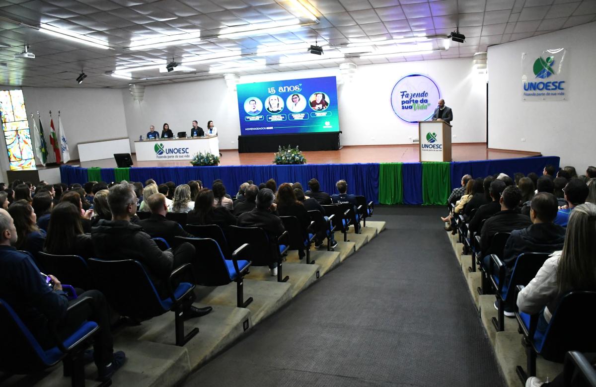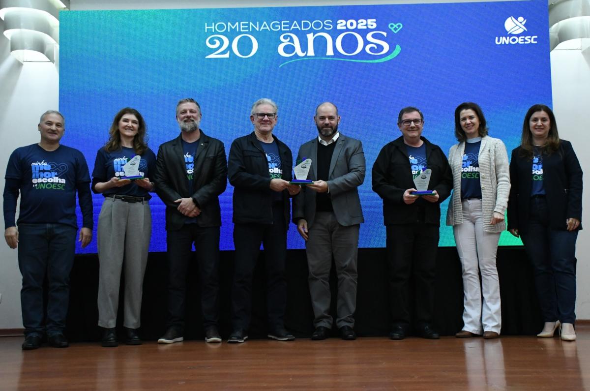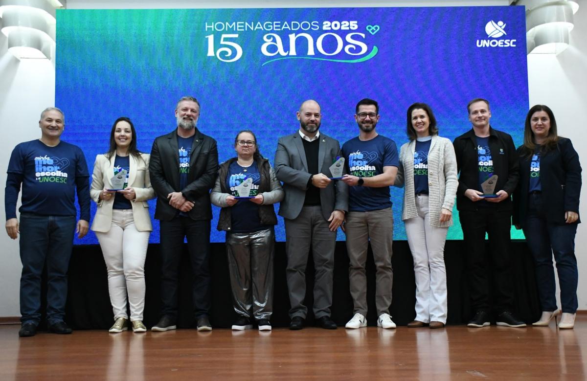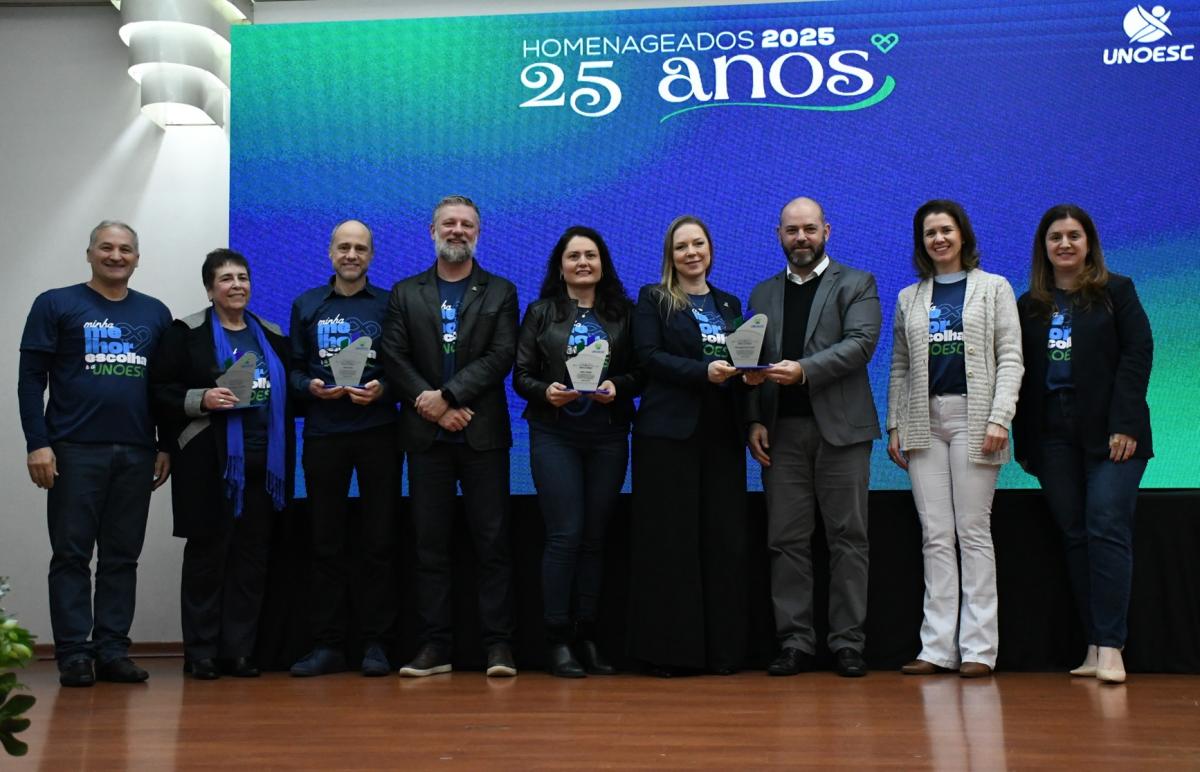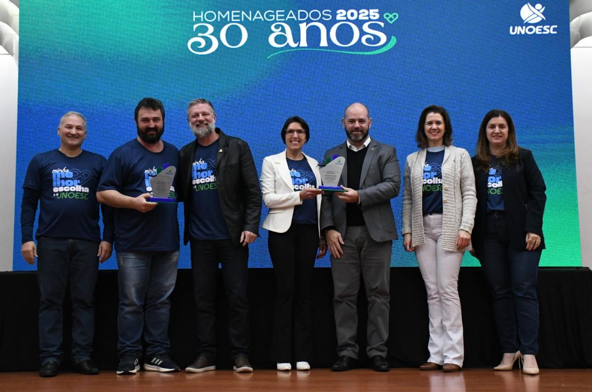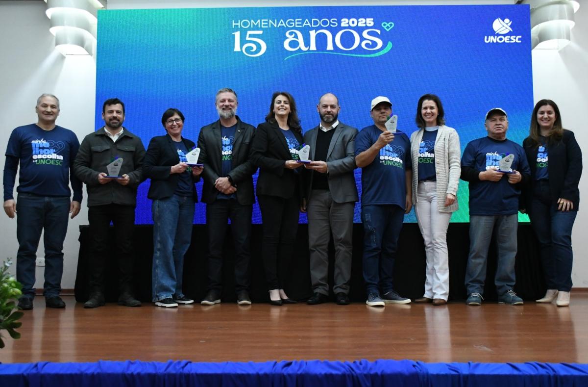 Os colaboradores da Unoesc Joaçaba, Campos Novos, Capinzal e Concórdia que, em 2025, completaram cinco, dez, 15, 20, 25 e 30 anos de serviços prestados à Instituição, foram homenageados em cerimônia realizada na sexta-feira (15), no Auditório Afonso Dresch. Prestigiado por dirigentes, coordenadores, professores e técnicos administrativos, o evento também celebrou os 29 anos de credenciamento da Universidade junto ao Ministério da Educação (MEC).